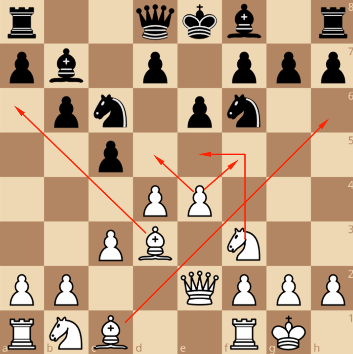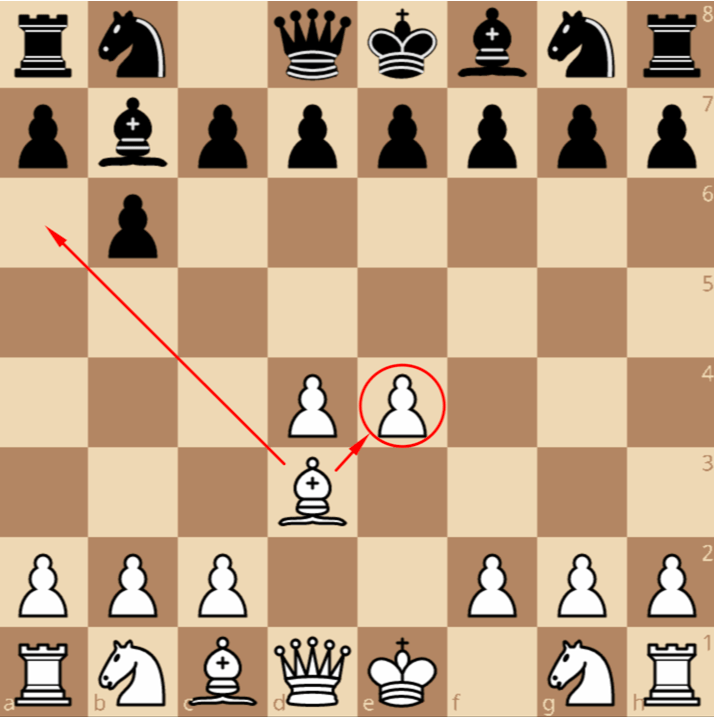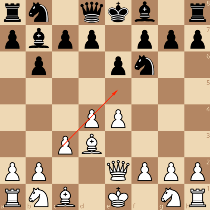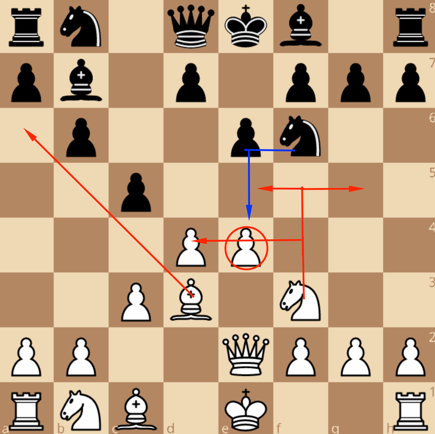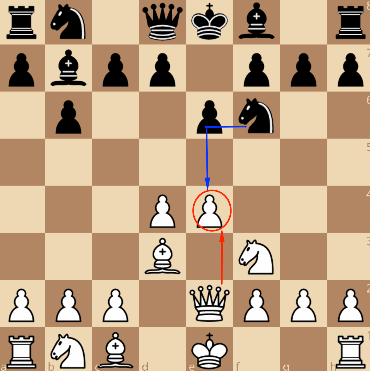 Белые часто реагируют ходом 4. Фe2! …, который не только защищает пешку e4, но и готовит рокировку в короткую сторону.